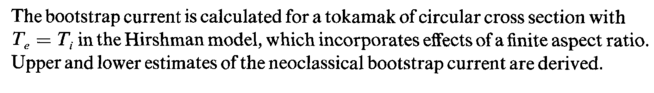 The bootstrap current is calculated for a tokamak of circular cross section with Τβ = Τ ι in the Hirshman model, which incorporates effects of a finite aspect ratio. Upper and lower estimates of the neoclassical bootstrap current are derived.