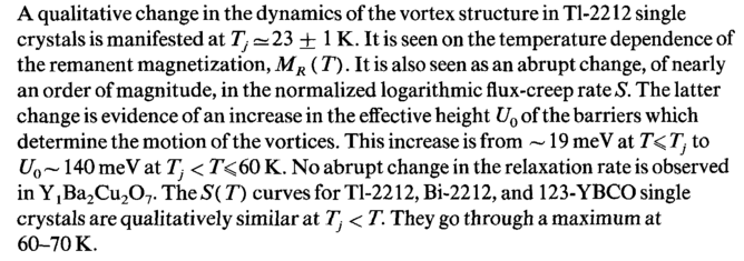 A qualitative change in the dynamics of the vortex structure in Tl-2212 single crystals is manifested at 7), =s 23 + 1 K. It is seen on the temperature dependence of the remanent magnetization, MR (T). It is also seen as an abrupt change, of nearly an order of magnitude, in the normalized logarithmic flux-creep rate S. The latter change is evidence of an increase in the effective height U0 of the barriers which determine the motion of the vortices. This increase is from ~ 19 meV at !T< 7} to U0 ~ 140 me V at 7} < Г< 60 К. No abrupt change in the relaxation rate is observed in Y!Ba2Cu207. TheSX T) curves for Tl-2212, Bi-2212, and 123-YBCO single crystals are qualitatively similar at Tj < T. They go through a maximum at 60-70K.