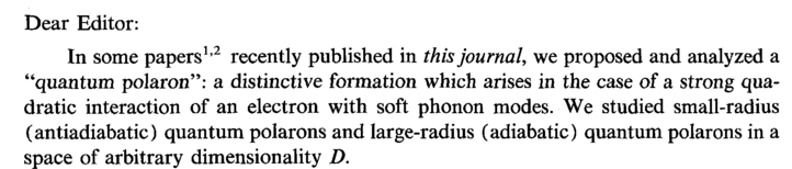 Dear Editor: In some papers1'2 recently published in this journal, we proposed and analyzed a "quantum polaron": a distinctive formation which arises in the case of a strong quadratic interaction of an electron with soft phonon modes. We studied small-radius (antiadiabatic) quantum polarons and large-radius (adiabatic) quantum polarons in a space of arbitrary dimensionality D.