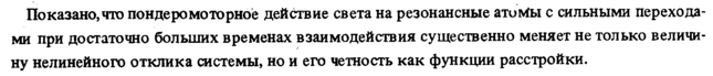 Показано,что пондеромоторное действие света на резонансные атоМы с сильными переходами при достаточно больших временах взаимодействия существенно меняет не только величину нелинейного отклика системы, но и его четность как функции расстройки.