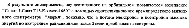 В результате эксперимента, осуществленного на орбитальном космическом комплексе "Салют-7-Союз~Т13-Космос-1669" с помощью сцинтилляционного времяпролетного магнитного спектрометра "Мария", показано, что в потоке электронов и позитронов высоких энергий во внутреннем радиационном поясе Земли преобладают электроны.