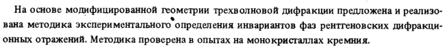 На основе модифицированной геометрии трехволновой дифракции предложена и реализо-вана методика экспериментального определения инвариантов фаз рентгеновских дифракционных отражений. Методика проверена в опытах на монокристаллах кремния.