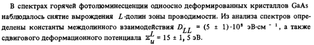 В спектрах горячей фотолюминесценции одноосно деформированных кристаллов GaAs наблюдалось снятие вырождения L -долин зоны проводимости. Из анализа спектров определены константы междолинного взаимодействия = (5 ± 1) -108 эВ-см а также сдвигового деформационного потенциала srfj = 15 ± 1, 5 эВ.