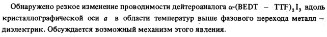 Обнаружено резкое изменение проводимости дейтероаналога a-(BEDT TTF)2I3 вдоль кристаллографической оси а в области температур выше фазового перехода металл — диэлектрик. Обсуждается возможный механизм этого явления.