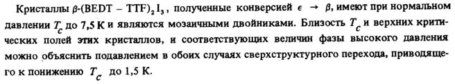 Кристаллы /HBEDT TTF)213, полученные конверсией е -> 0, имеют при нормальном давлении Τ до 7,5 К и являются мозаичными двойниками. Близость Г, и верхних крити-ческих полей этих кристаллов, и соответствующих величин фазы высокого давления можно объяснить подавлением в обоих случаях сверхструктурного перехода, приводящего к понижению 7\ до 1,5 К.
