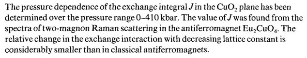 The pressure dependence of the exchange integral Jin the Cu02 plane has been determined over the pressure range 0-410 kbar. The value of /was found from the spectra of two-magnon Raman scattering in the antiferromagnet Eu2Cu04. The relative change in the exchange interaction with decreasing lattice constant is considerably smaller than in classical antiferromagnets.