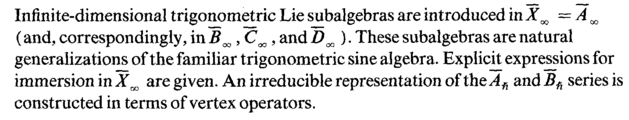 Infinite-dimensional trigonometric Lie subalgebras are introduced in Xw —A^ (and, correspondingly, in B^yC^, and ). These subalgebras are natural generalizations of the familiar trigonometric sine algebra. Explicit expressions for immersion in Хж are given. An irreducible representation of the An and Βή series is constructed in terms of vertex operators.