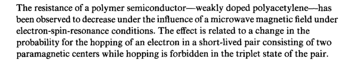 The resistance of a polymer semiconductor—weakly doped polyacetylene—has been observed to decrease under the influence of a microwave magnetic field under electron-spin-resonance conditions. The effect is related to a change in the probability for the hopping of an electron in a short-lived pair consisting of two paramagnetic centers while hopping is forbidden in the triplet state of the pair.