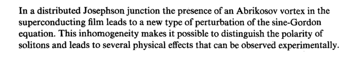 In a distributed Josephson junction the presence of an Abrikosov vortex in the superconducting film leads to a new type of perturbation of the sine-Gordon equation. This inhomogeneity makes it possible to distinguish the polarity of solitons and leads to several physical effects that can be observed experimentally.