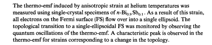 The thermo-emf induced by anisotropic strain at helium temperatures was measured using single-crystal specimens of «-Bi0 9 Sb0л. As a result of this strain, all electrons on the Fermi surface (FS) flow over into a single ellipsoid. The topological transition to a single-ellipsoidal FS was monitored by observing the quantum oscillations of the thermo-emf. A characteristic peak is observed in the thermo-emf for strains corresponding to a change in the topology.