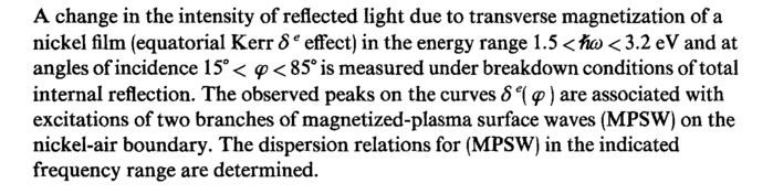 A change in the intensity of reflected light due to transverse magnetization of a nickel film (equatorial Kerr δe effect) in the energy range 1.5 < fko < 3.2 eV and at angles of incidence 15° < φ < 85° is measured under breakdown conditions of total internal reflection. The observed peaks on the curves δ e( φ) are associated with excitations of two branches of magnetized-plasma surface waves (MPSW) on the nickel-air boundary. The dispersion relations for (MPSW) in the indicated frequency range are determined.