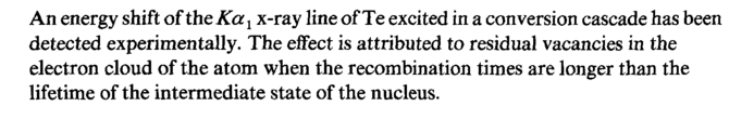 An energy shift of theKa1 x-ray line of Те excited in a conversion cascade has been detected experimentally. The effect is attributed to residual vacancies in the electron cloud of the atom when the recombination times are longer than the lifetime of the intermediate state of the nucleus.