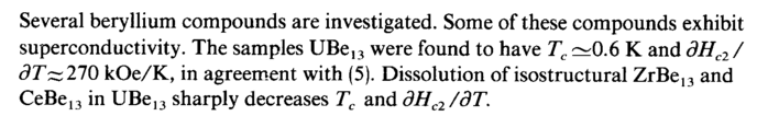 Several beryllium compounds are investigated. Some of these compounds exhibit superconductivity. The samples UBe13 were found to have Tc ~0.6 ë and ÄîÓ2/ Äô~210 kOe/K, in agreement with (5). Dissolution of isostructural ZrBe13 and CeBe13 in UBe13 sharply decreases Tc and ÄîÓ2/Äô.