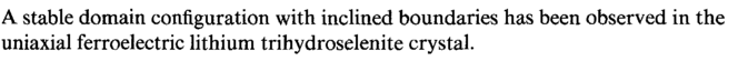 A stable domain configuration with inclined boundaries has been observed in the uniaxial ferroelectric lithium trihydroselenite crystal.