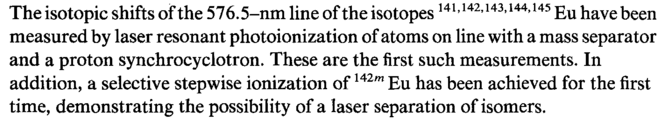 The isotopic shifts of the 576.5-nm line of the isotopes 141»i42.i43,i44,i45 ^ ^ауе measured by laser resonant photoionization of atoms on line with a mass separator and a proton synchrocyclotron. These are the first such measurements. In addition, a selective stepwise ionization of142m Eu has been achieved for the first time, demonstrating the possibility of a laser separation of isomers.
