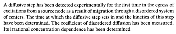 A diffusive step has been detected experimentally for the first time in the egress of excitations from a source node as a result of migration through a disordered system of centers. The time at which the diffusive step sets in and the kinetics of this step have been determined. The coefficient of disordered diffusion has been measured. Its irrational concentration dependence has been determined.