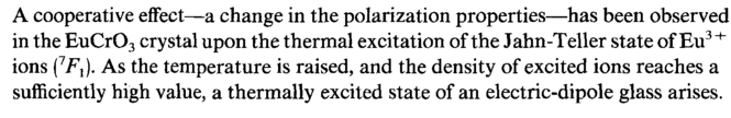 A cooperative effect—a change in the polarization properties—has been observed in the EuCr03 crystal upon the thermal excitation of the Jahn-Teller state of Eu3 + ions CFi). As the temperature is raised, and the density of excited ions reaches a sufficiently high value, a thermally excited state of an electric-dipole glass arises.