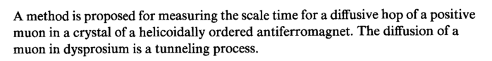 A method is proposed for measuring the scale time for a diffusive hop of a positive muon in a crystal of a helicoidally ordered antiferromagnet. The diffusion of a muon in dysprosium is a tunneling process.