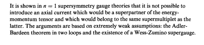 It is shown ίη η = 1 supersymmetry gauge theories that it is not possible to introduce an axial current which would be a superpartner of the energy-momentum tensor and which would belong to the same supermultiplet as the latter. The arguments are based on extremely weak assumptions: the Adler-Bardeen theorem in two loops and the existence of a Wess-Zumino supergauge.
