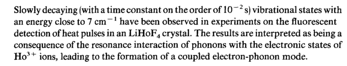 Slowly decaying (with a time constant on the order of 10 ~ 2 s) vibrational states with an energy close to 7 cm -1 have been observed in experiments on the fluorescent detection of heat pulses in an LiHoF4 crystal. The results are interpreted as being a consequence of the resonance interaction of phonons with the electronic states of Ho3+ ions, leading to the formation of a coupled electron-phonon mode.