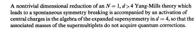 A nontrivial dimensional reduction of an N = 1, d > 4 Yang-Mills theory which leads to a spontaneous symmetry breaking is accompanied by an activation of central charges in the algebra of the expanded supersymmetry in d = 4, so that the associated masses of the supermultiplets do not acquire quantum corrections.