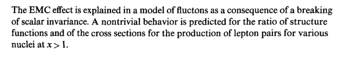 The EMC effect is explained in a model of fluctons as a consequence of a breaking of scalar invariance. A nontrivial behavior is predicted for the ratio of structure functions and of the cross sections for the production of lepton pairs for various nuclei at x> 1.