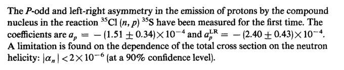 The P-odd and left-right asymmetry in the emission of protons by the compound nucleus in the reaction 35C1 (n,p) 35S have been measured for the first time. The coefficients are ap = (1.51 ± 0.34) X 1(Г4 and <£R (2.40 ± 0.43)X1СГ4. A limitation is found on the dependence of the total cross section on the neutron helicity: \a„ \ < 2X 10~6 (at a 90% confidence level).