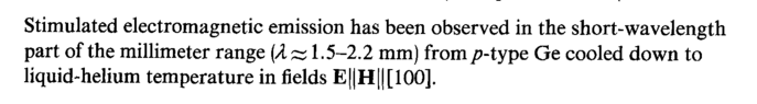Stimulated electromagnetic emission has been observed in the short-wavelength part of the millimeter range (λ 1.5-2.2 mm) from /?-type Ge cooled down to liquid-helium temperature in fields E||H[|[100].