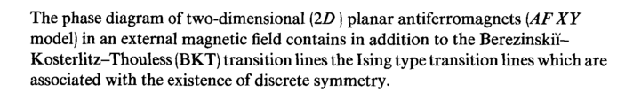 The phase diagram of two-dimensional (2D) planar antiferromagnets (AFXY model) in an external magnetic field contains in addition to the Berezinskii-Kosterlitz-Thouless (BKT) transition lines the Ising type transition lines which are associated with the existence of discrete symmetry.