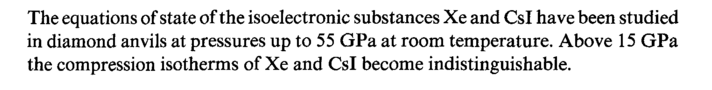 The equations of state of the isoelectronic substances Xe and Csl have been studied in diamond anvils at pressures up to 55 GPa at room temperature. Above 15 GPa the compression isotherms of Xe and Csl become indistinguishable.