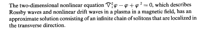 The two-dimensional nonlinear equation — φ + φ 2 = 0, which describes Rossby waves and nonlinear drift waves in a plasma in a magnetic field, has an approximate solution consisting of an infinite chain of solitons that are localized in the transverse direction.