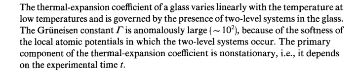 The thermal-expansion coefficient of a glass varies linearly with the temperature at low temperatures and is governed by the presence of two-level systems in the glass. The Gruneisen constant Γ is anomalously large (~ 102), because of the softness of the local atomic potentials in which the two-level systems occur. The primary component of the thermal-expansion coefficient is nonstationary, i.e., it depends on the experimental time t.