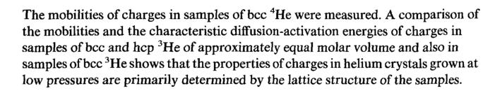 The mobilities of charges in samples of bcc 4He were measured. A comparison of the mobilities and the characteristic diffusion-activation energies of charges in samples of bcc and hep 3He of approximately equal molar volume and also in samples of bcc 3He shows that the properties of charges in helium crystals grown at low pressures are primarily determined by the lattice structure of the samples.