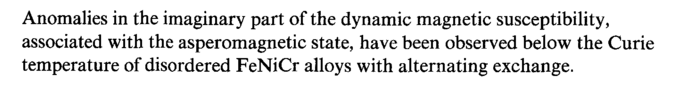 Anomalies in the imaginary part of the dynamic magnetic susceptibility, associated with the asperomagnetic state, have been observed below the Curie temperature of disordered FeNiCr alloys with alternating exchange.