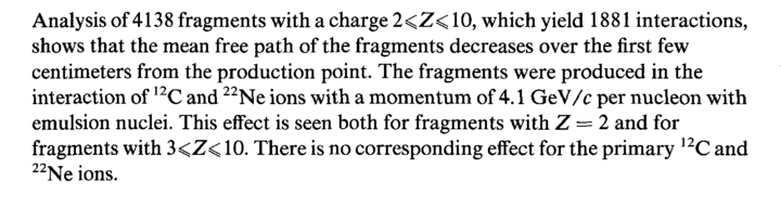 Analysis of 4138 fragments with a charge 2<Z< 10, which yield 1881 interactions, shows that the mean free path of the fragments decreases over the first few centimeters from the production point. The fragments were produced in the interaction of 12C and 22Ne ions with a momentum of 4.1 GeV/c per nucleon with emulsion nuclei. This effect is seen both for fragments with Ζ — 2 and for fragments with 3<Z< 10. There is no corresponding effect for the primary 12C and 22Ne ions.