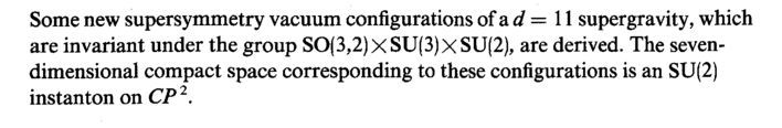 Some new supersymmetry vacuum configurations of a d — 11 supergravity, which are invariant under the group SO(3,2)xSU(3)xSU(2), are derived. The seven-dimensional compact space corresponding to these configurations is an SU(2) instanton on CP2.