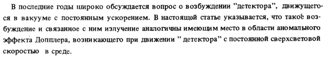 В последние годы широко обсуждается вопрос о возбуждении "детектора", движущегося в вакууме с постоянным ускорением. В настоящей статье указывается, что такое возбуждение и связанное с ним излучение аналогичны имеющим место в области аномального эффекта Допплера, возникающего при движении " детектора" с постоянной сверхсветовой скоростью в среде.