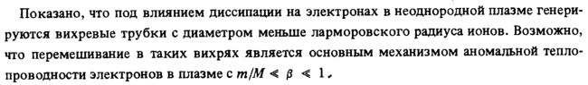 Показано, что под влиянием диссипации на электронах в неоднородной плазме генерируются вихревые трубки с диаметром меньше ларморовского радиуса ионов. Возможно, что перемешивание в таких вихрях является основным механизмом аномальной теплопроводности электронов в плазме с т/М < β < 1,