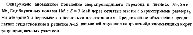 Обнаружено аномальное поведение сверхпроводящего перехода в пленках Nb3Snn Nb3 Ge,o6nученных ионами Не+ с Ε = 3 МэВ через сетчатые маски с характерными размера-, ми отверстий и перемычек в несколько десятков мкм. Предложенное объяснение предполагает существование в решетке А-15 дально действующи χ напряжений^озникающи χ вокруг раз упорядоченных участков.