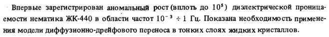 Впервые зарегистрирован аномальный рост (вплоть до 105) диэлектрической проницаемости нематика ЖК-440 в области частот 10"3 -г 1 Гц. Показана необходимость применения модели диффузионно-дрейфового переноса в тонких слоях жидких кристаллов.