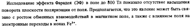 Исследование эффекта Фарадея (ЭФ) в поле до 800 Тл показало отсутствие насыщения поворота плоскости поляризации от поля. Предполагается, что это явление может быть связано с ростом обменных взаимодействий в магнитном поле, а также с влиянием поля на электронные переходы в ионах Fe3*.