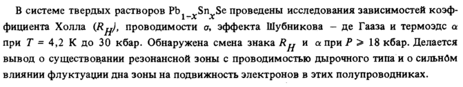 В системе твердых растворов Pb Sn Se проведены исследования зависимостей коэф-фициента Холла (ЛдгЛ проводимости σ, эффекта Шубникова де Гааза и термоэдс α при Τ = 4,2 К до 30 кбар. Обнаружена смена знака и а при Ρ > 18 кбар. Делается вывод о существовании резонансной зоны с проводимостью дырочного типа и о сильном влиянии флуктуации дна зоны на подвижность электронов в этих полупроводниках.