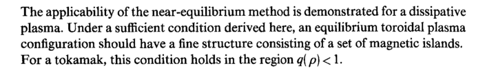 The applicability of the near-equilibrium method is demonstrated for a dissipative plasma. Under a sufficient condition derived here, an equilibrium toroidal plasma configuration should have a fine structure consisting of a set of magnetic islands. For a tokamak, this condition holds in the region q(p)<\.