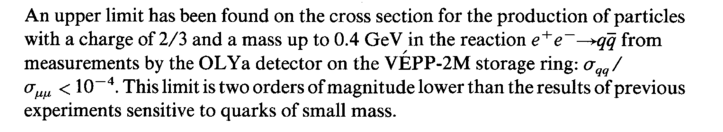 An upper limit has been found on the cross section for the production of particles with a charge of 2/3 and a mass up to 0.4 GeV in the reaction e^e~^qq from measurements by the OLYa detector on the VEPP-2M storage ring: aqq/ σμμ < Ю-4. This limit is two orders of magnitude lower than the results of previous experiments sensitive to quarks of small mass.