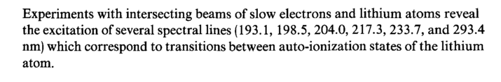 Experiments with intersecting beams of slow electrons and lithium atoms reveal the excitation of several spectral lines (193.1, 198.5, 204.0, 217.3, 233.7, and 293.4 nm) which correspond to transitions between auto-ionization states of the lithium atom.