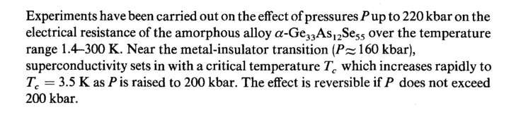 Experiments have been carried out on the effect of pressures Ρ up to 220 kbar on the electrical resistance of the amorphous alloy «-Ge33As12Se55 over the temperature range 1.4-300 K. Near the metal-insulator transition (P~ 160 kbar), superconductivity sets in with a critical temperature Tc which increases rapidly to Tc = 3.5 К as Ρ is raised to 200 kbar. The effect is reversible if Ρ does not exceed 200 kbar.