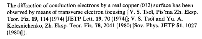 The diffraction of conduction electrons by a real copper (012) surface has been observed by means of transverse electron focusing {V. S. Tsoi, Pis'ma Zh. Eksp. Teor. Fiz. 19, 114 (1974) [JETP Lett. 19, 70 (1974)]; V. S. Tsoi and Yu. A. Kolesnichenko, Zh. Eksp. Teor. Fiz. 78, 2041 (1980) [Sov. Phys. JETP 51, 1027 (1980)]}.