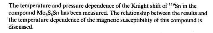 The temperature and pressure dependence of the Knight shift of119Sn in the compound Mo6S8Sn has been measured. The relationship between the results and the temperature dependence of the magnetic susceptibility of this compound is discussed.