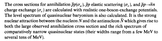 The cross sections for annihilation ρρ(σα), pp elastic scattering (ae), and pp—*nn charge exchange (ac) are calculated with realistic one-boson-exchange potentials. The level spectrum of quasinuclear baryonium is also calculated. It is the strong nuclear attraction between the nucleon TV and the antinucleon N which gives rise to both the large observed annihilation cross section and the rich spectrum of comparatively narrow quasinuclear states (their widths range from a few MeV to several tens of MeV).