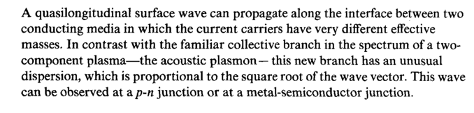 A quasilongitudinal surface wave can propagate along the interface between two conducting media in which the current carriers have very different effective masses. In contrast with the familiar collective branch in the spectrum of a two-component plasma—the acoustic plasmon— this new branch has an unusual dispersion, which is proportional to the square root of the wave vector. This wave can be observed at a p-n junction or at a metal-semiconductor junction.